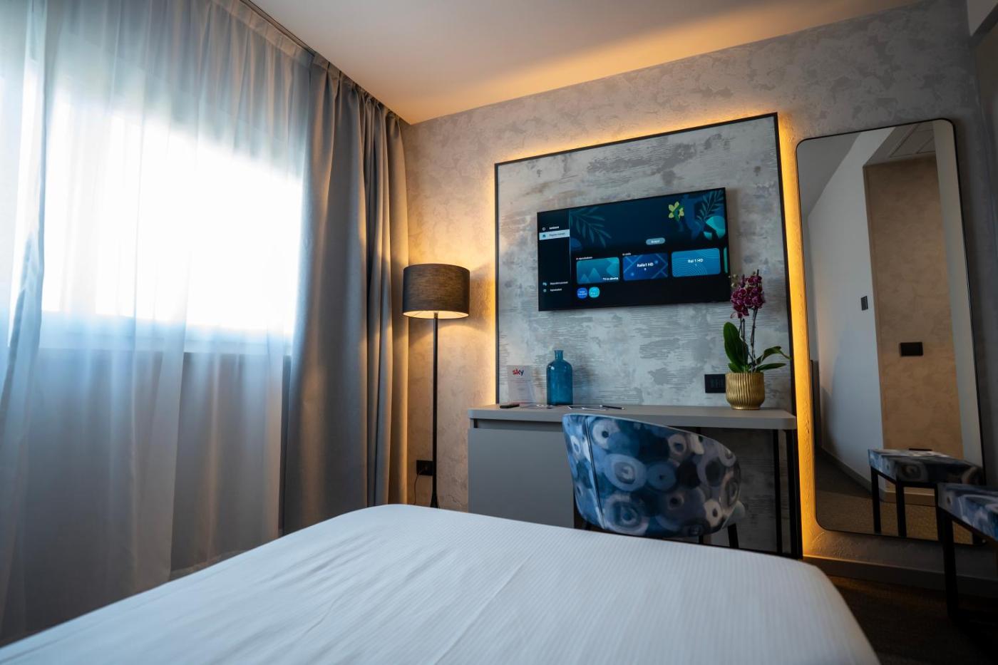Camera Tripla Classic. Questa camera tripla presenta 1 bagno privato con vasca o doccia,di cortesia, bidet e asciugacapelli. La camera tripla è dotata di aria condizionata, pareti insonorizzate, minibar, armadio e TV a schermo piatto con canali satellitari. La sistemazione dispone di 2 letti. ;