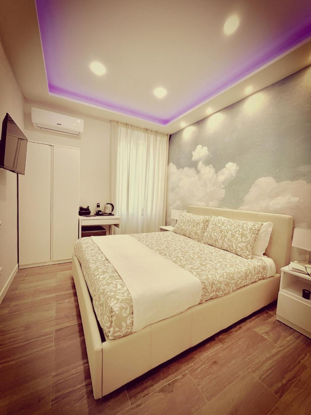 Camera Matrimoniale. Camera matrimoniale provvista di bagno privato con doccia, asciugacapelli, bidet edi cortesia. La sistemazione è dotata di aria condizionata,per la preparazione di tè e caffè, guardaroba, cassaforte e TV a schermo piatto con canali satellitari. L’alloggio dispone di 1 letto. ;